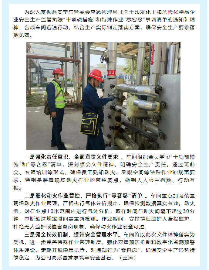 合成車間多措并舉全面落實安全生產(chǎn)監(jiān)管執(zhí)法要求