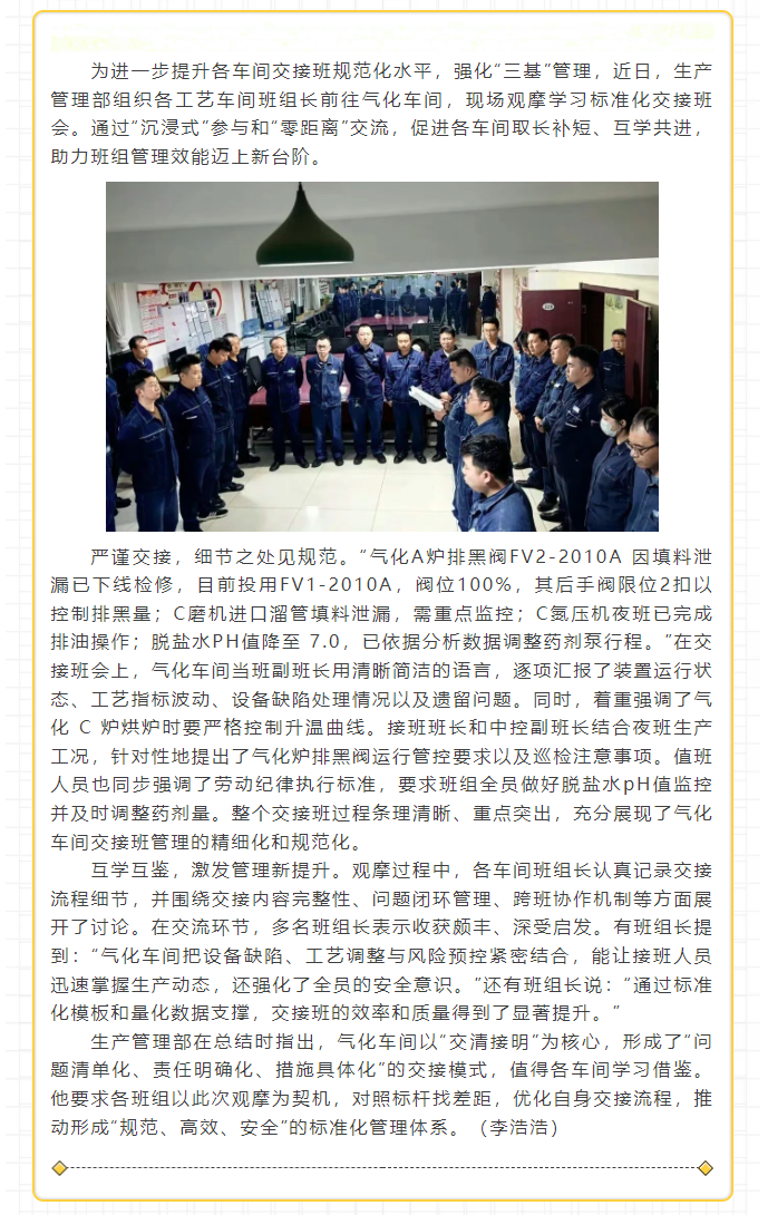 強(qiáng)化“三基”管理——生產(chǎn)管理部組織班組長(zhǎng)觀摩氣化車間標(biāo)準(zhǔn)化交接班