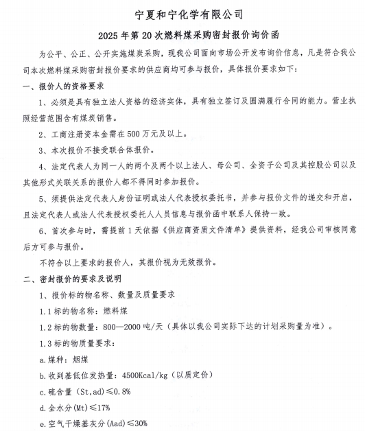 寧夏和寧化學(xué)有限公司2025年第20次燃料煤采購密封報價詢價函.pdf
