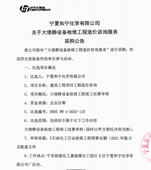 寧夏和寧化學(xué)有限公司關(guān)于大修靜設(shè)備檢修工程造價咨詢服務(wù)采購公告.pdf