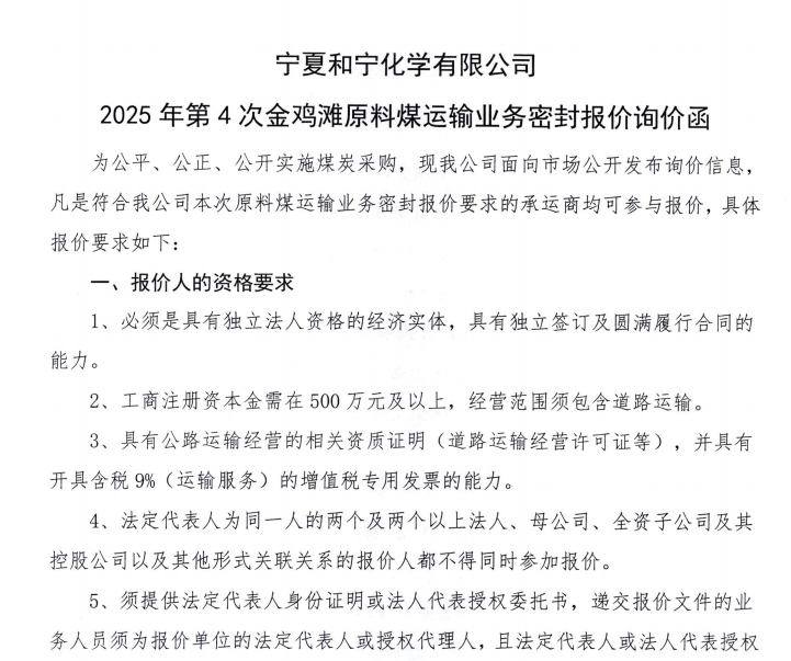寧夏和寧化學(xué)有限公司2025 年第4次金雞灘原料煤運輸業(yè)務(wù)密封報價詢價函.pdf [全文]