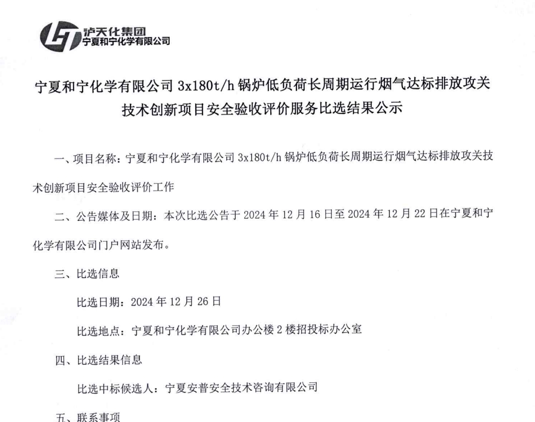 寧夏和寧化學(xué)有限公司3x180th鍋爐低負(fù)荷長周期運(yùn)行煙氣達(dá)標(biāo)排放攻關(guān)技術(shù)創(chuàng)新項目安全驗收評價服務(wù)比選結(jié)果公示.pdf [全文]