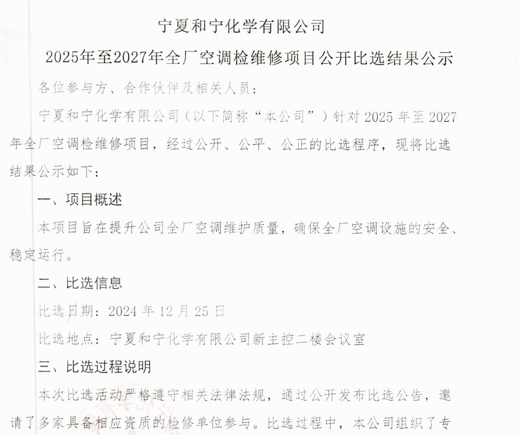 寧夏和寧化學(xué)有限公司2025年至2027年全廠空調(diào)檢維修項目公開比選結(jié)果公示.pdf [全文]