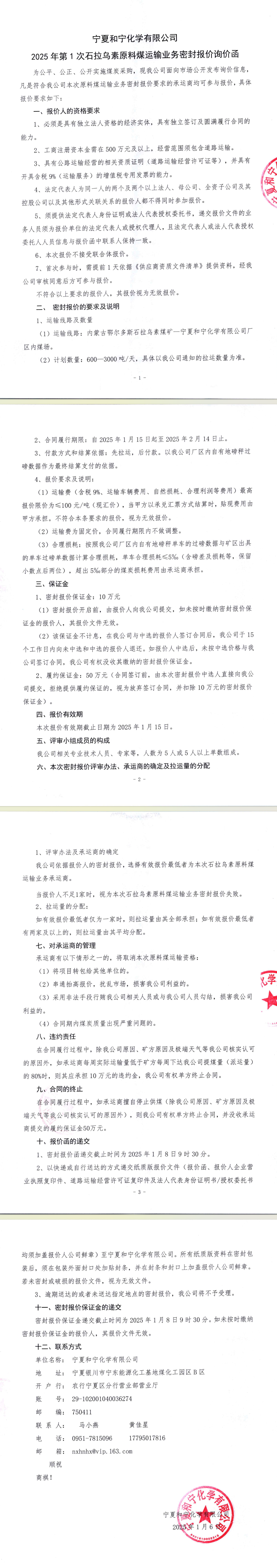 寧夏和寧化學(xué)有限公司2025年第1次石拉烏素原料煤運(yùn)輸業(yè)務(wù)密封報價詢價函 [全文]