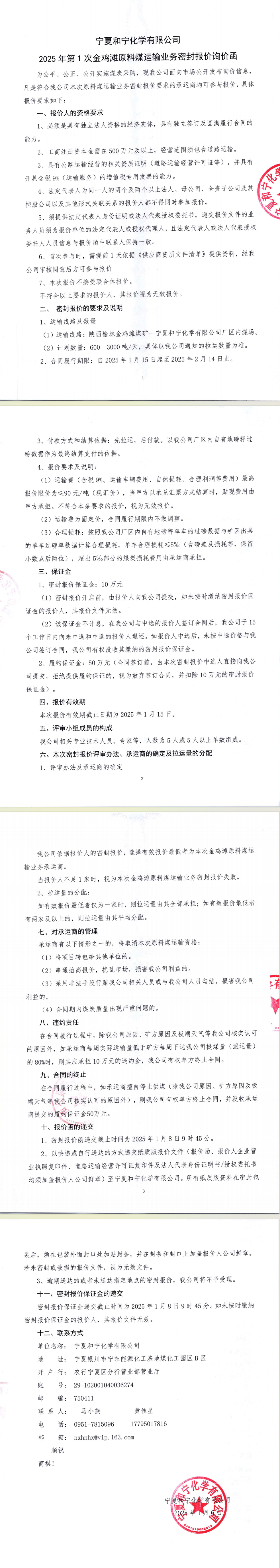 寧夏和寧化學(xué)有限公司2025年第1次金雞灘原料煤運(yùn)輸業(yè)務(wù)密封報價詢價函 [全文]