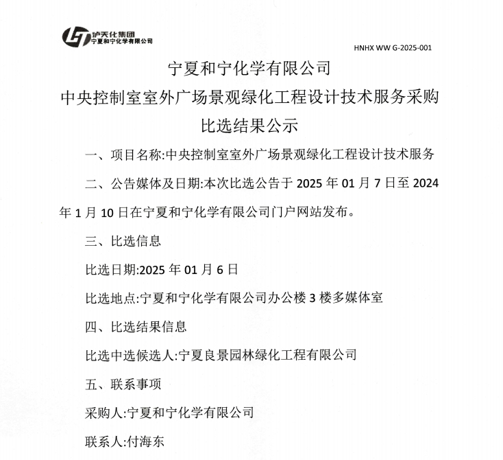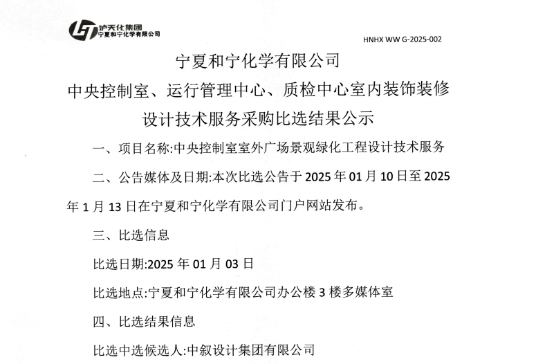 寧夏和寧化學(xué)有限公司中央控制室室外廣場景觀綠化工程設(shè)計技術(shù)服務(wù)采購比選結(jié)果公示.pdf [全文]