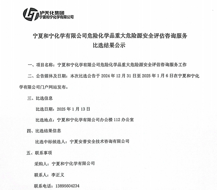 寧夏和寧化學(xué)有限公司危險化學(xué)品重大危險源安全評估咨詢服務(wù)比選結(jié)果公示.pdf [全文]