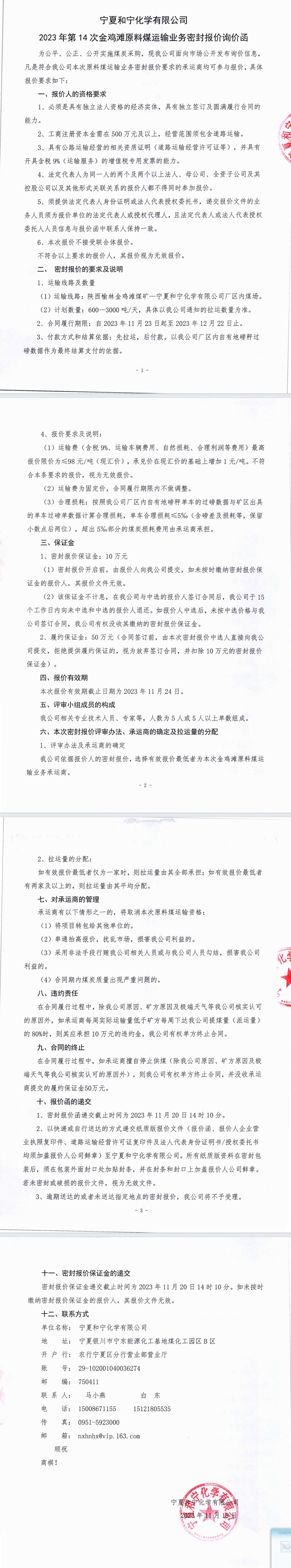寧夏和寧化學有限公司2023年第14次金雞灘原料煤運輸業(yè)務密封報價詢價函 [全文]