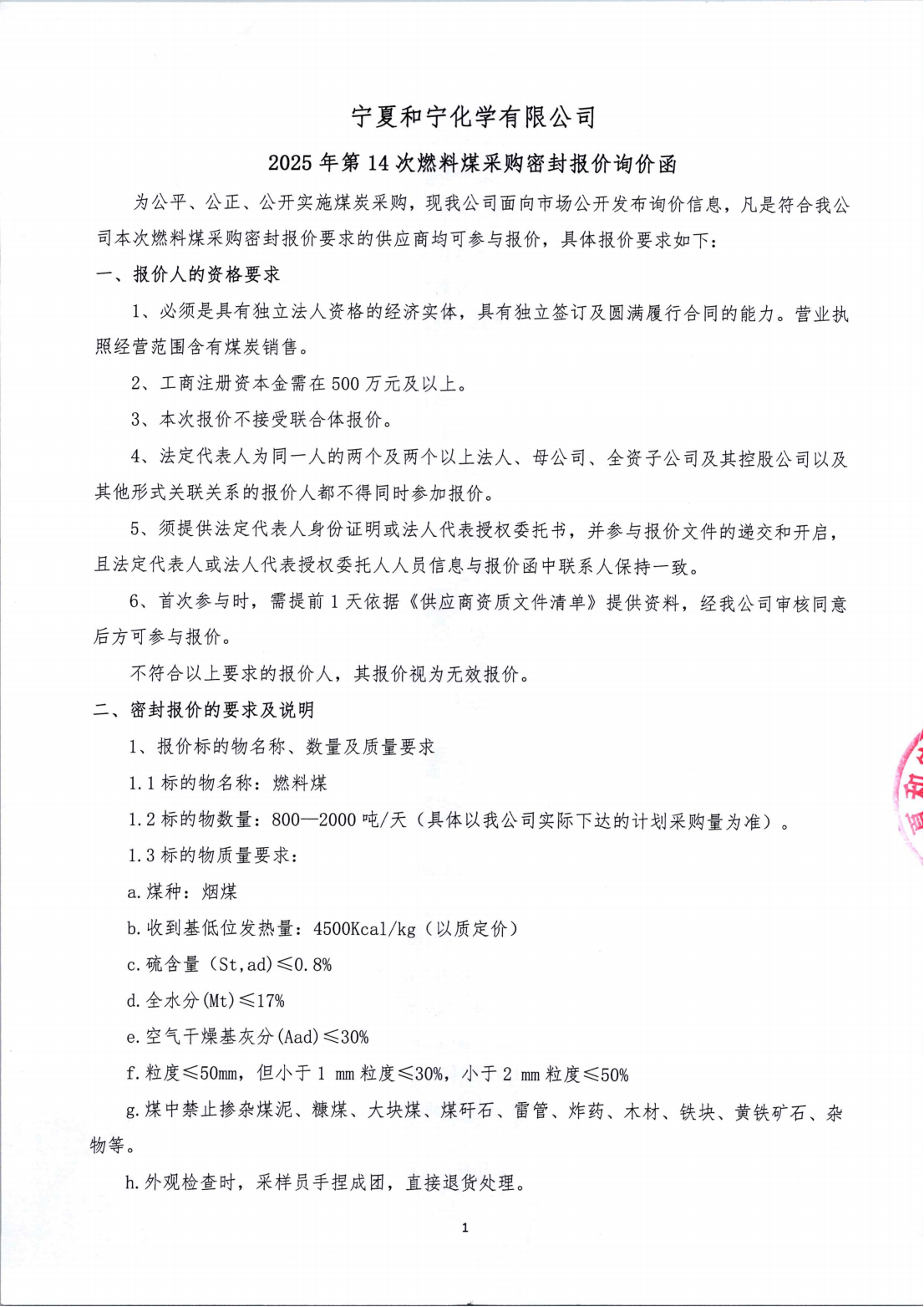 寧夏和寧化學(xué)有限公司2025年第14次燃料煤采購密封報價詢價函附件下載 [全文]