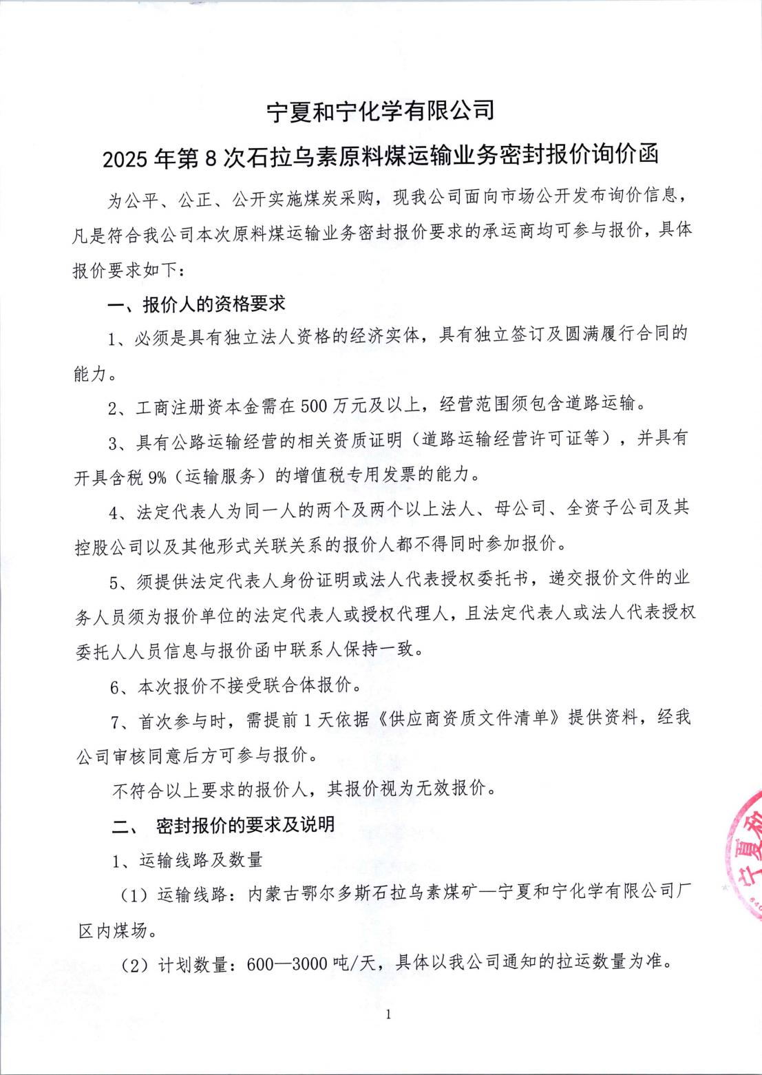 寧夏和寧化學(xué)有限公司2025年第8次金雞灘原料煤運輸業(yè)務(wù)密封報價詢價函附件下載 [全文]