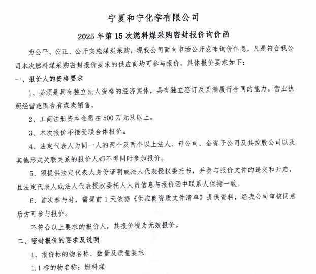 寧夏和寧化學(xué)有限公司2025年第15次燃料煤采購密封報價詢價函.pdf [全文]