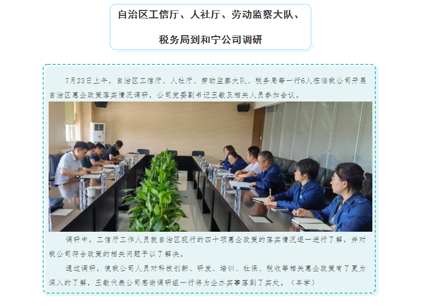 自治區(qū)工信廳、人社廳、勞動監(jiān)察大隊、稅務局到和寧公司調研