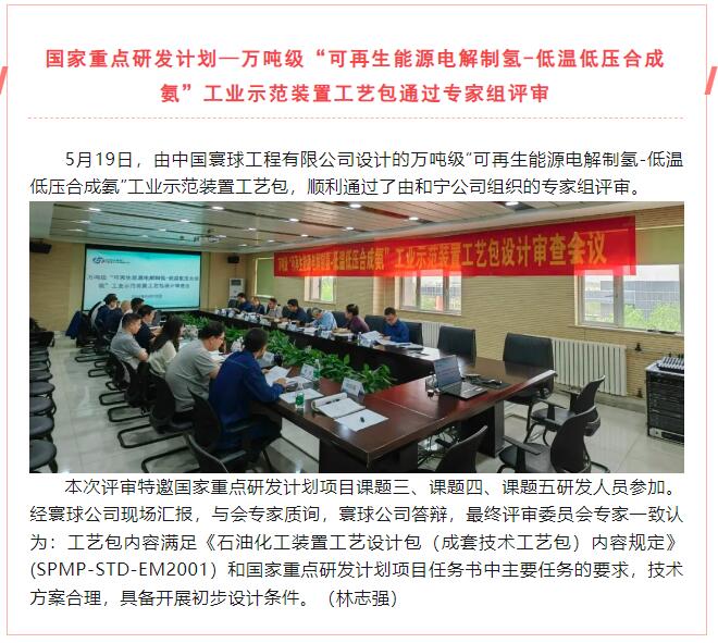 國家重點(diǎn)研發(fā)計(jì)劃—萬噸級“可再生能源電解制氫-低溫低壓合成氨”工業(yè)示范裝置工藝包通過專家組評審