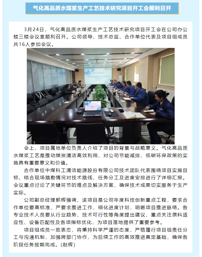 氣化高品質(zhì)水煤漿生產(chǎn)工藝技術(shù)研究項目開工會順利召開
