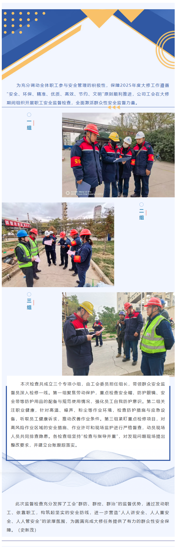 筑牢群眾安全防線,護(hù)航年度大修丨公司工會組織開展職工安全監(jiān)督檢查