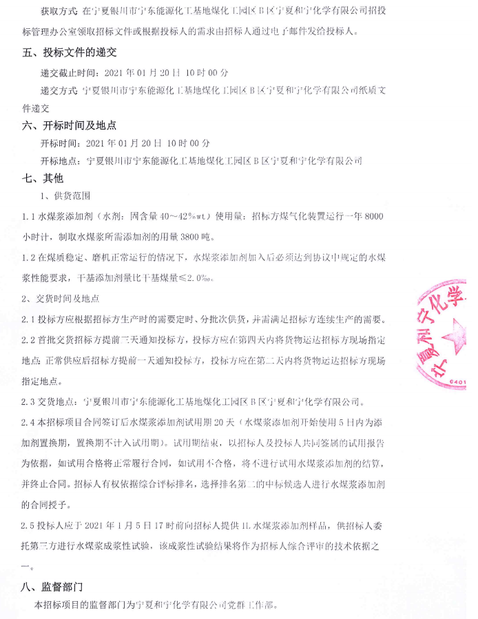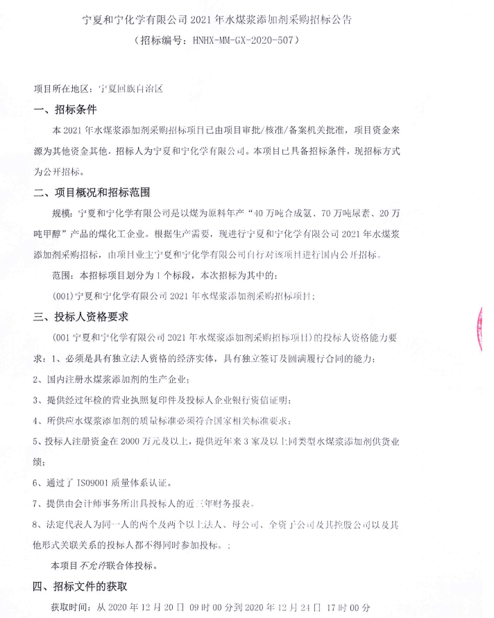 寧夏和寧化學(xué)有限公司2021年水煤漿添加劑采購(gòu)招標(biāo)公告