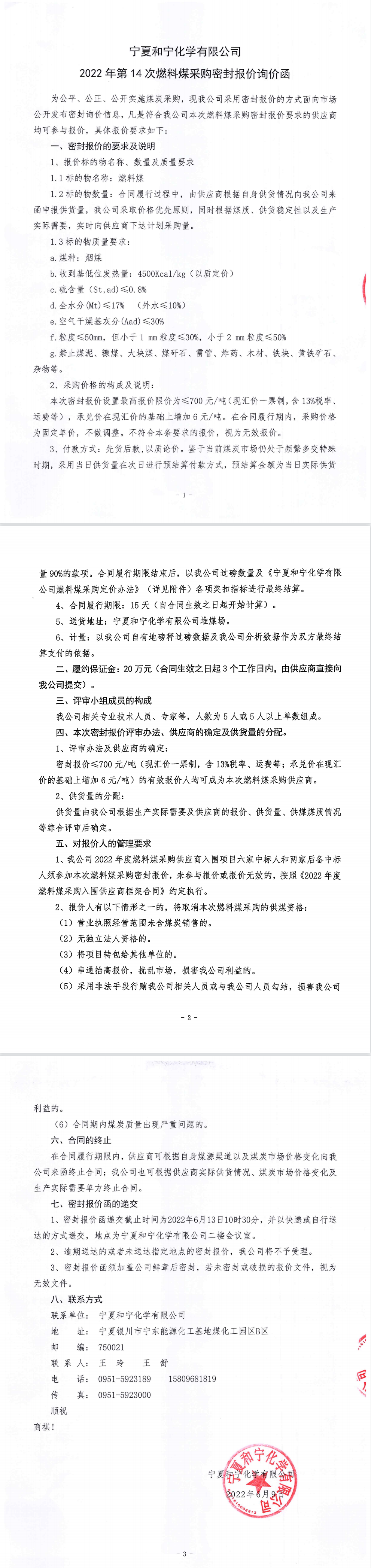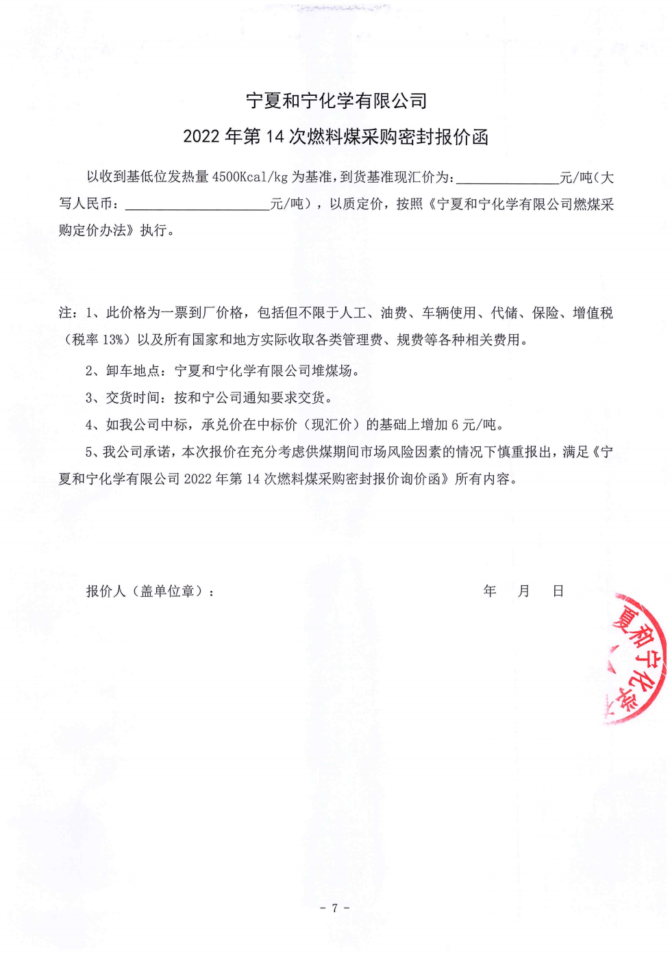 寧夏和寧化學(xué)有限公司2022年第14次燃料煤采購密封報(bào)價(jià)詢價(jià)函
