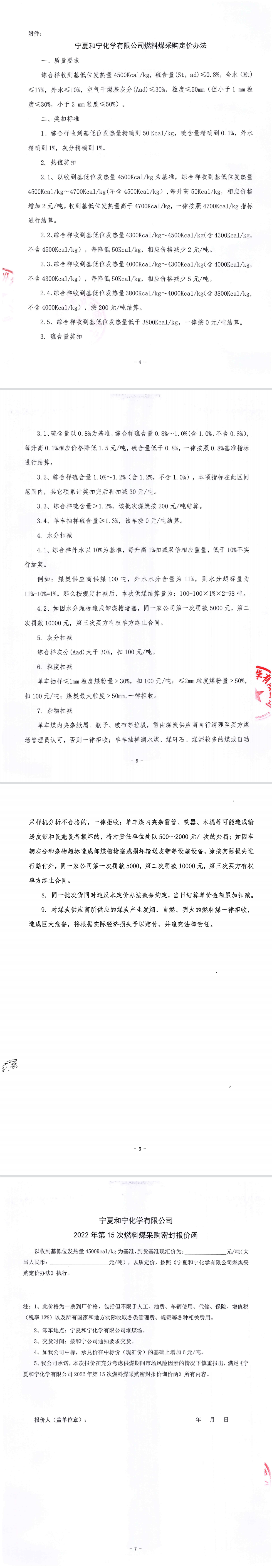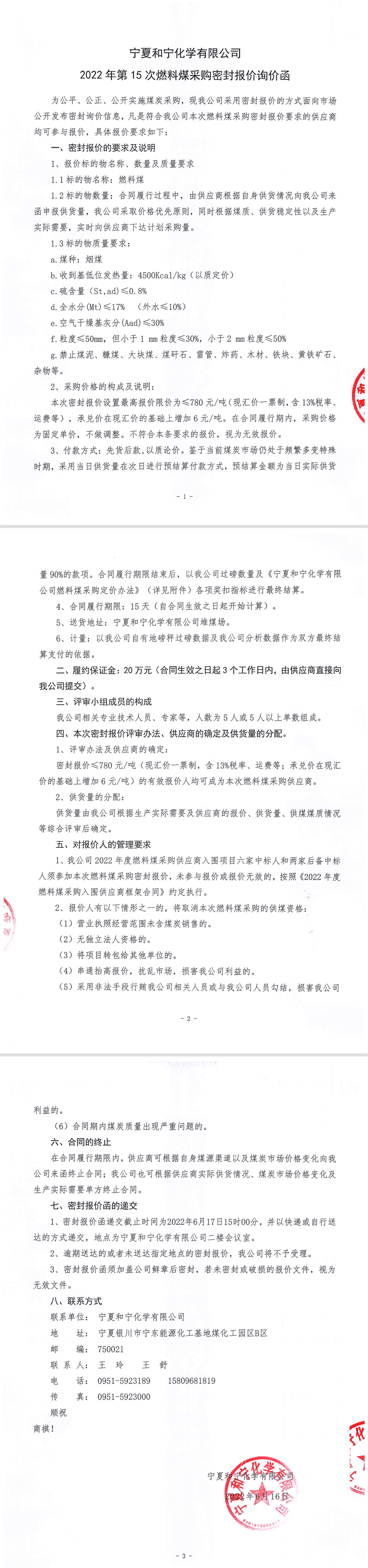 寧夏和寧化學(xué)有限公司2022年第15次燃料煤采購(gòu)密封報(bào)價(jià)詢價(jià)函