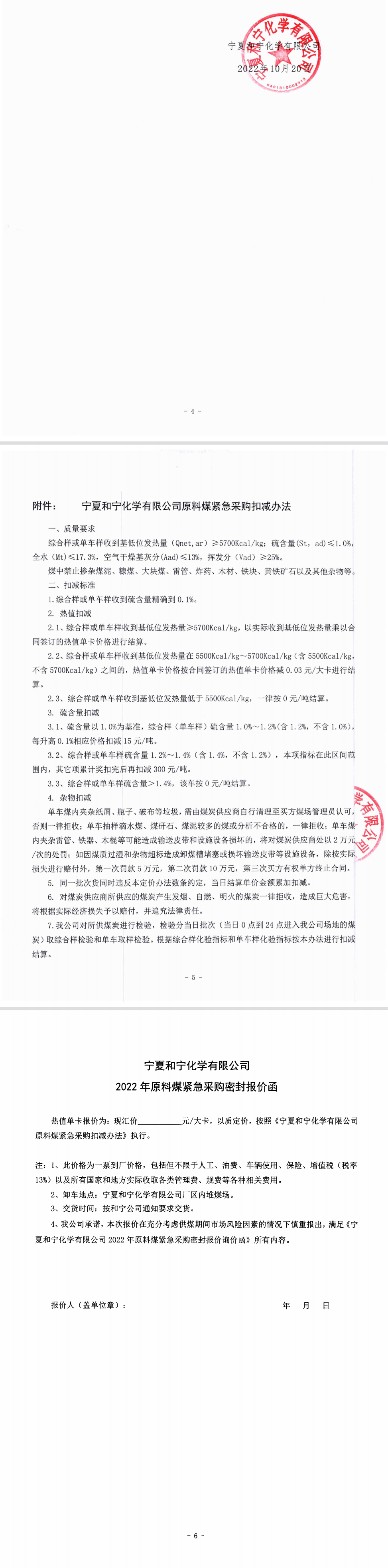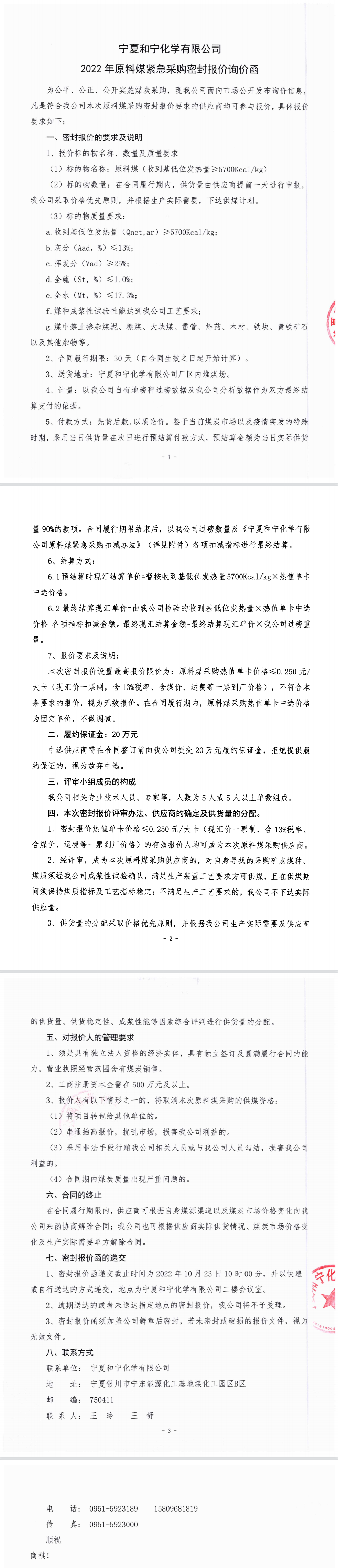 寧夏和寧化學(xué)有限公司2022年原料煤緊急采購密封報價詢價函