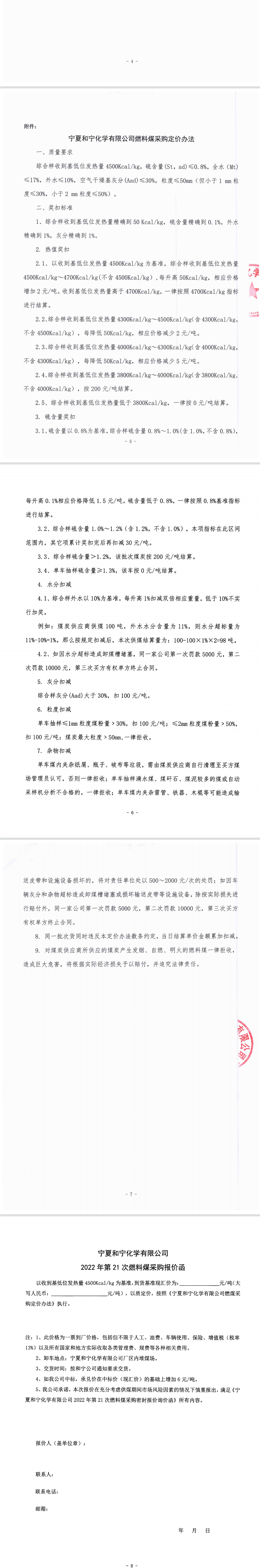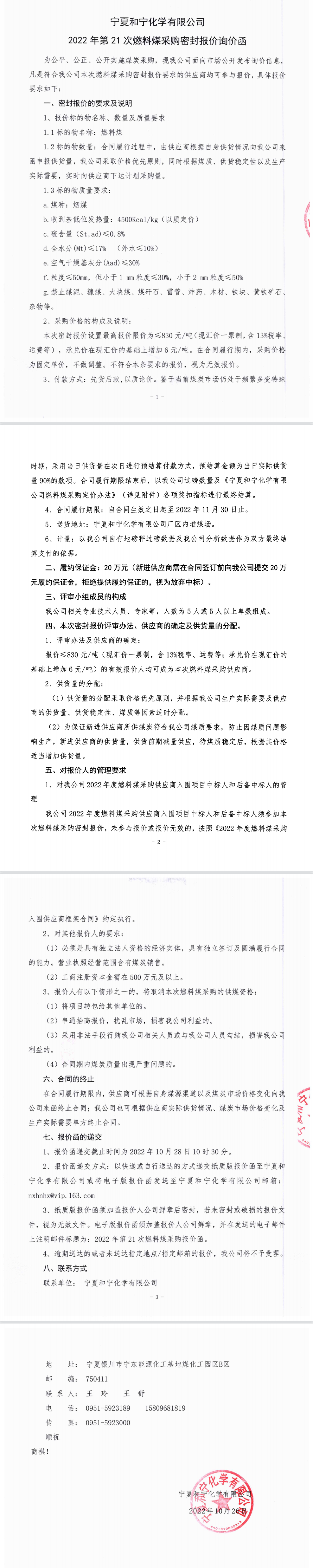寧夏和寧化學有限公司2022年第21次燃料煤采購密封報價詢價函