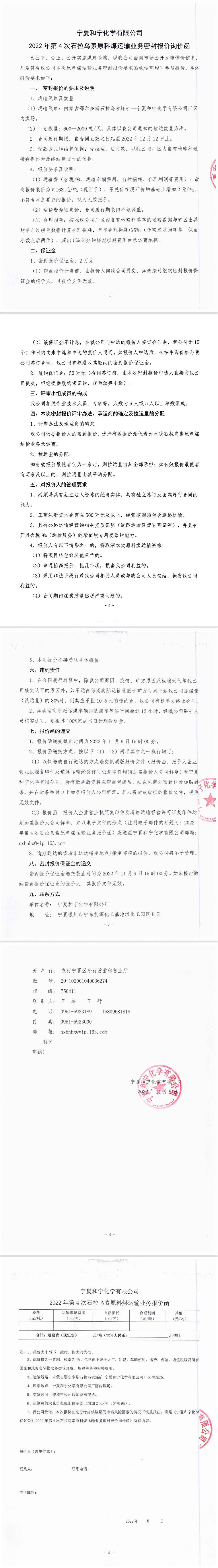 寧夏和寧化學(xué)有限公司2022年第4次石拉烏素原料煤運輸業(yè)務(wù)密封報價詢價函