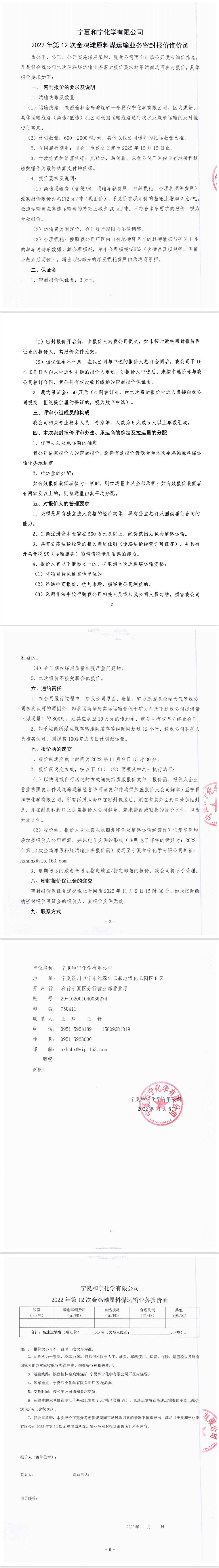 寧夏和寧化學(xué)有限公司2022年第12次金雞灘原料煤運輸業(yè)務(wù)密封報價詢價函