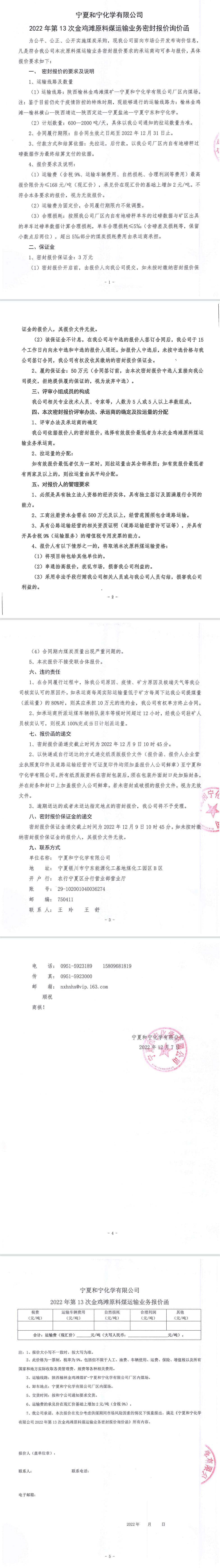 寧夏和寧化學(xué)有限公司2022年第13次金雞灘原料煤運輸業(yè)務(wù)密封報價詢價函