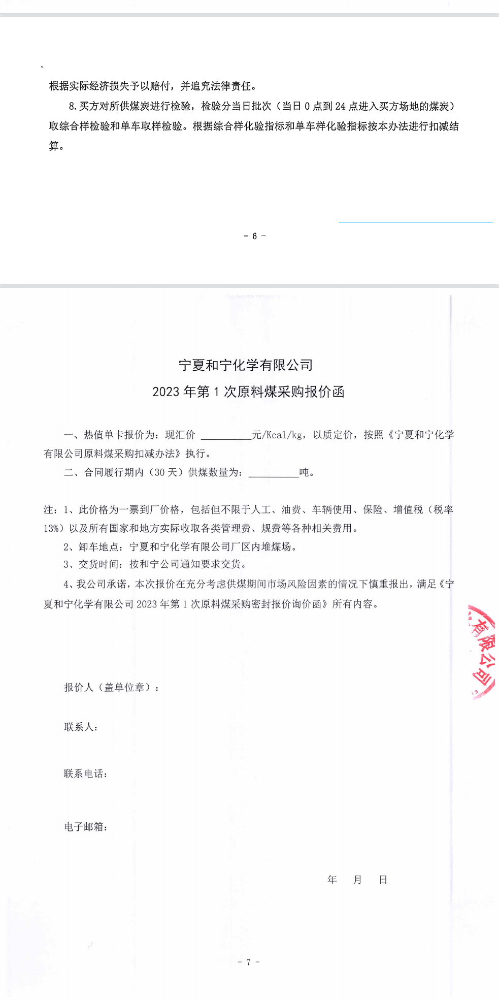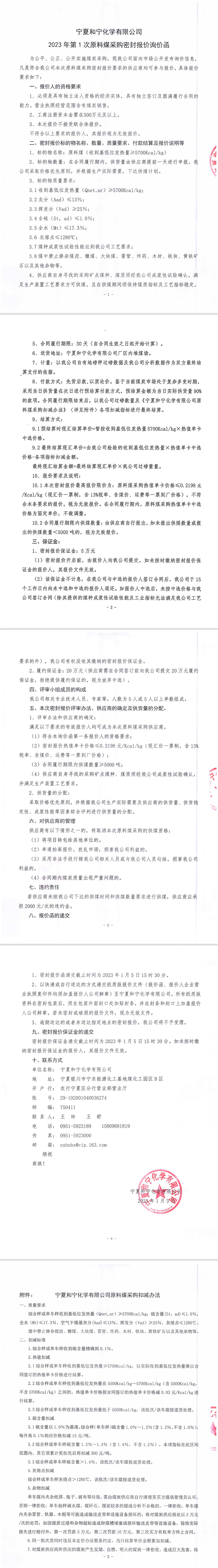 寧夏和寧化學(xué)有限公司2023年第1次原料煤采購密封報(bào)價(jià)詢價(jià)函