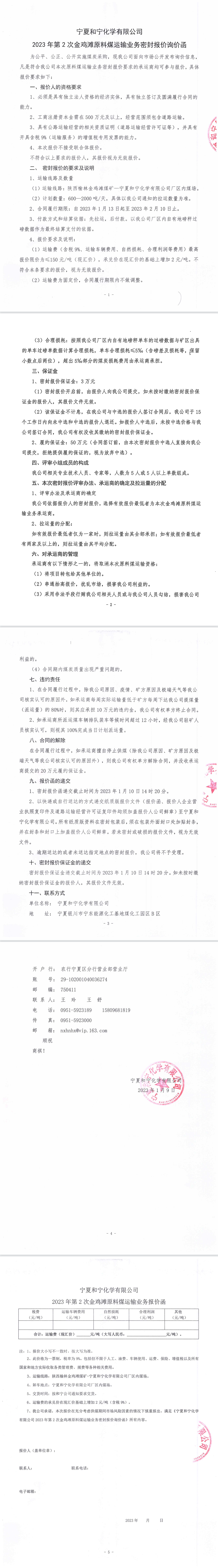 寧夏和寧化學(xué)有限公司2023年第2次金雞灘原料煤運輸業(yè)務(wù)密封報價詢價函