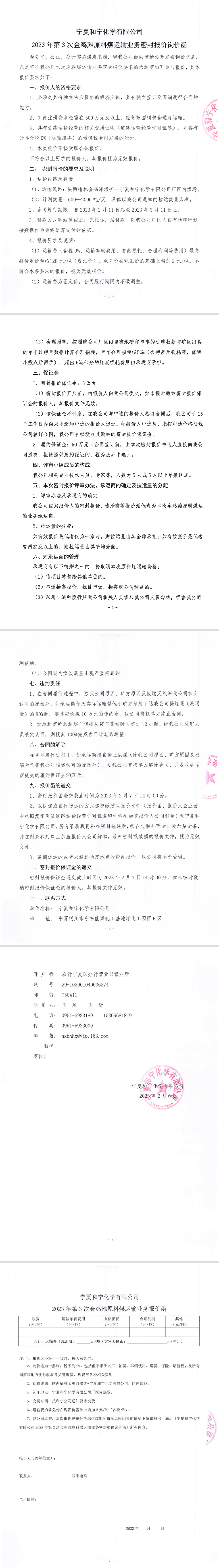 寧夏和寧化學(xué)有限公司2023年第3次金雞灘原料煤運(yùn)輸業(yè)務(wù)密封報(bào)價(jià)詢(xún)價(jià)函