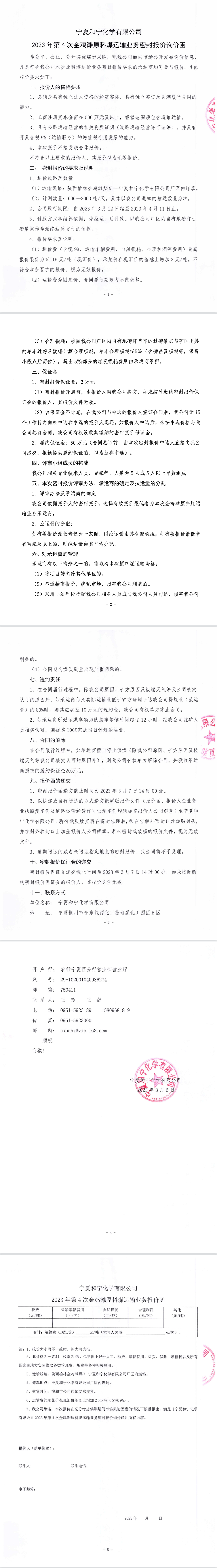 寧夏和寧化學(xué)有限公司2023年第4次金雞灘原料煤運輸業(yè)務(wù)密封報價詢價函