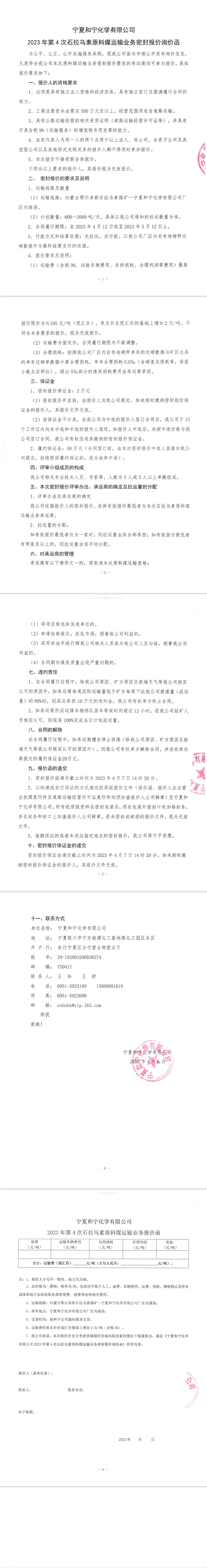 寧夏和寧化學(xué)有限公司2023年第4次石拉烏素原料煤運(yùn)輸業(yè)務(wù)密封報(bào)價(jià)詢價(jià)函