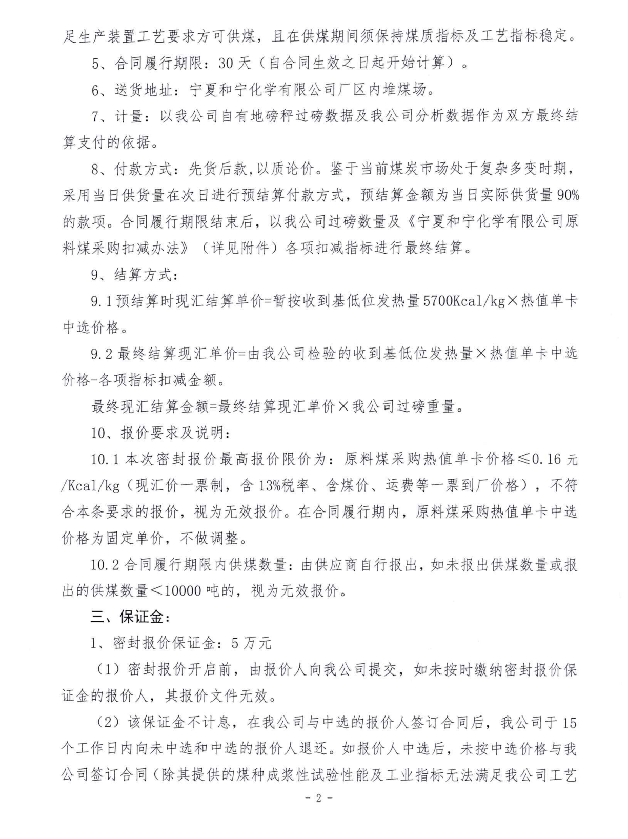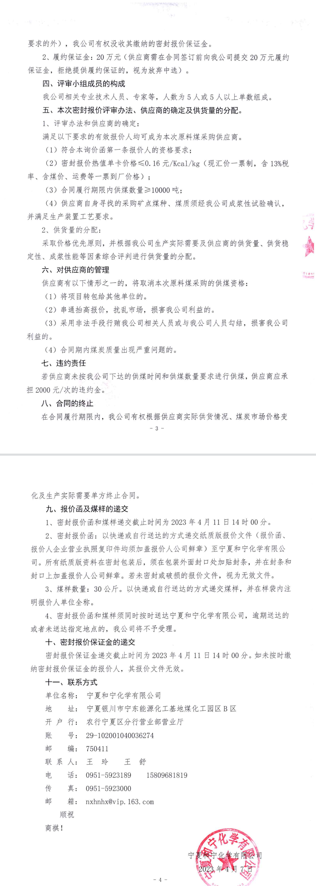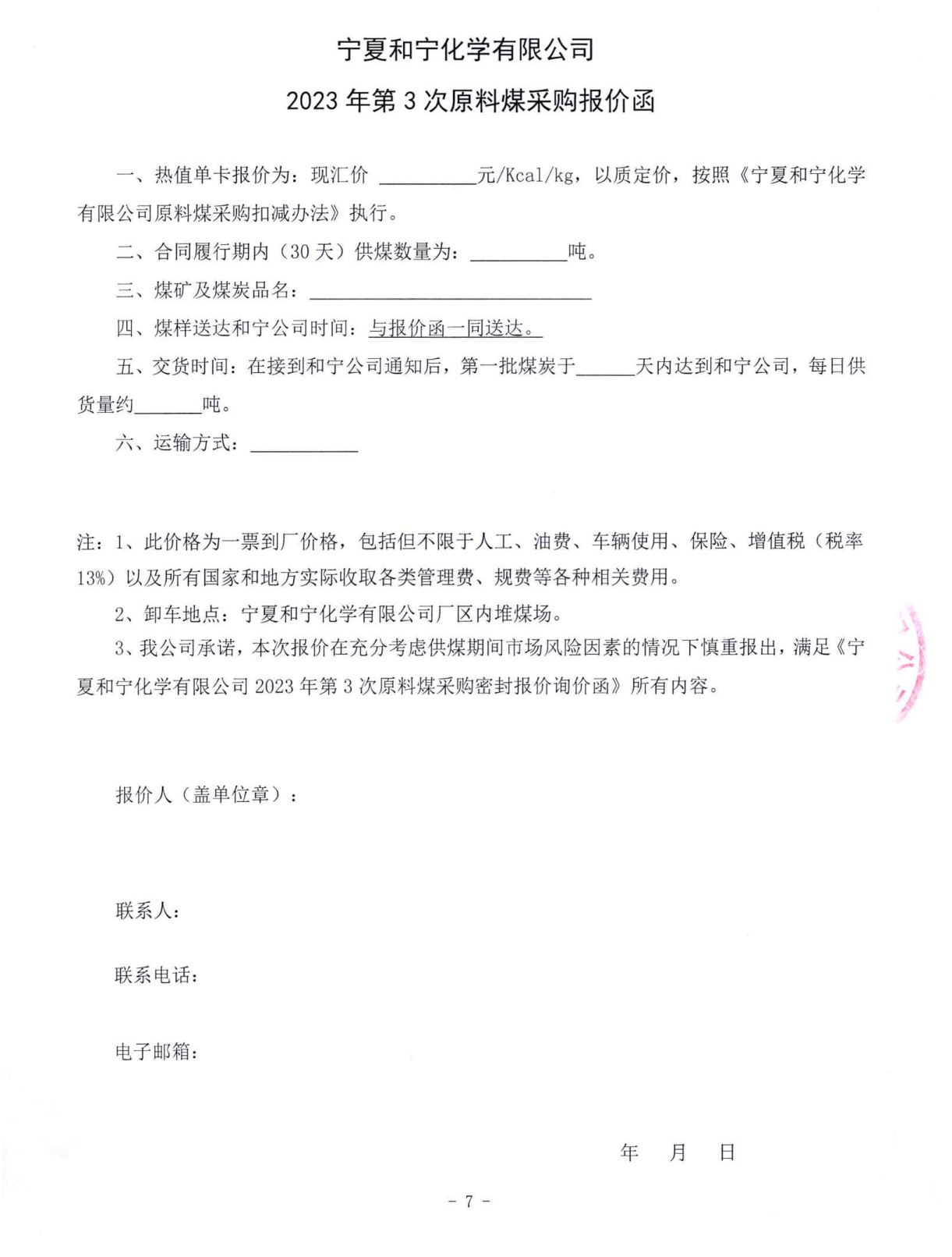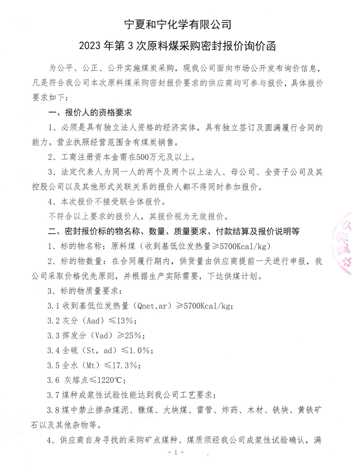 寧夏和寧化學(xué)有限公司2023年第3次原料煤采購(gòu)密封報(bào)價(jià)詢價(jià)函