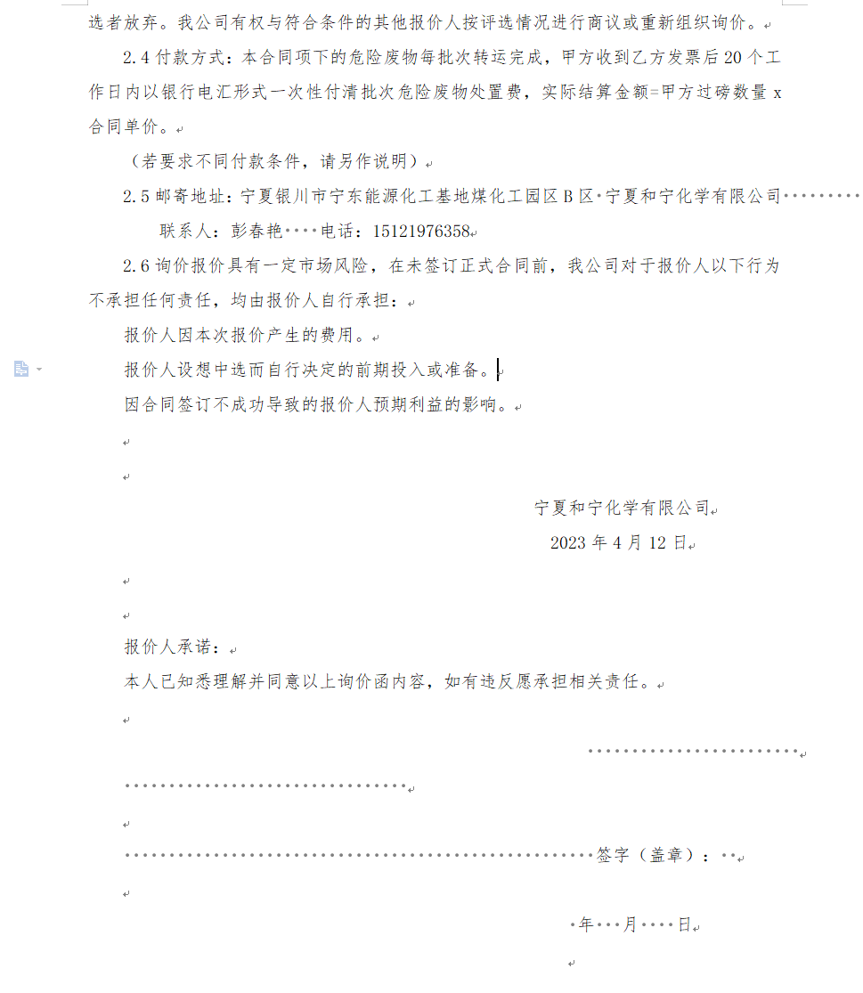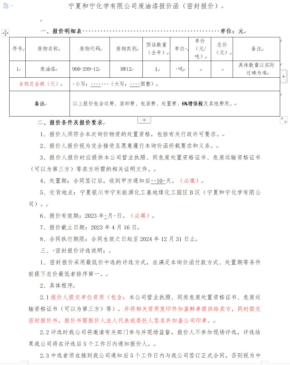 寧夏和寧化學(xué)有限公司廢油漆(密封報(bào)價(jià))