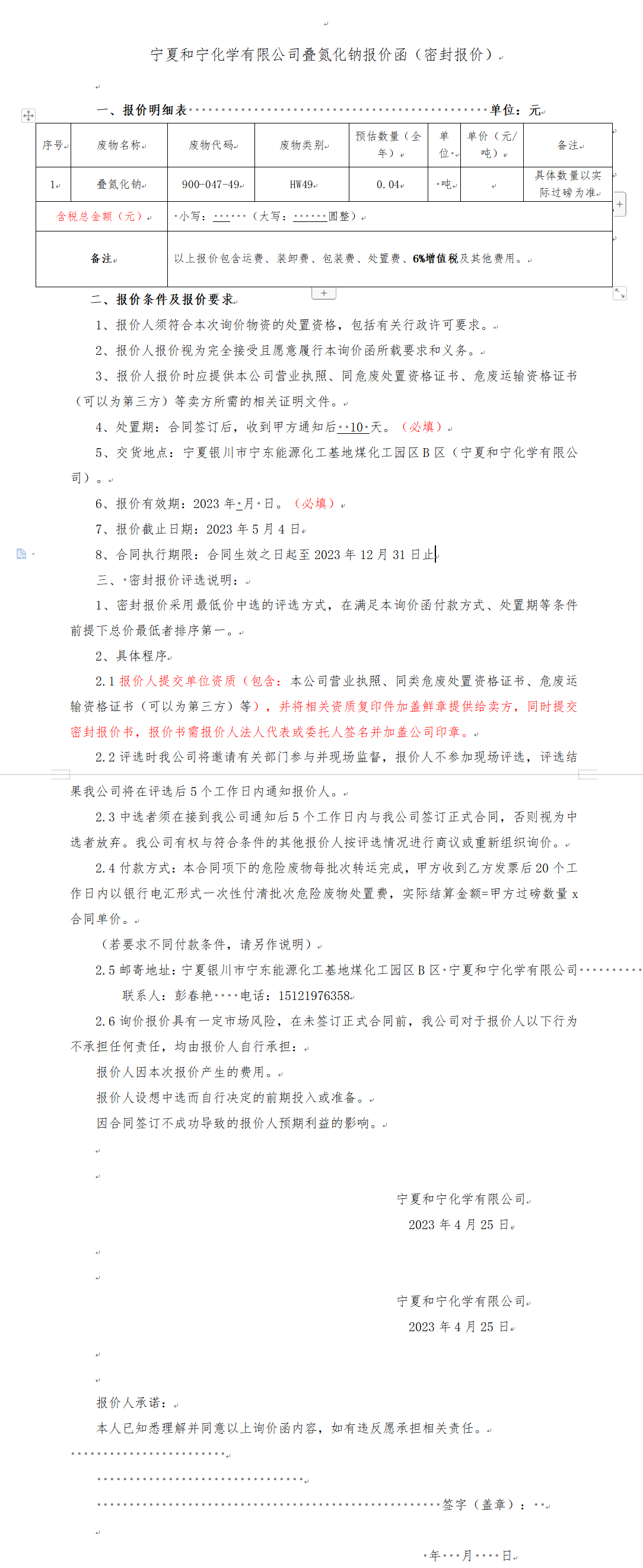 寧夏和寧化學有限公司疊氮化鈉報價函(密封報價)