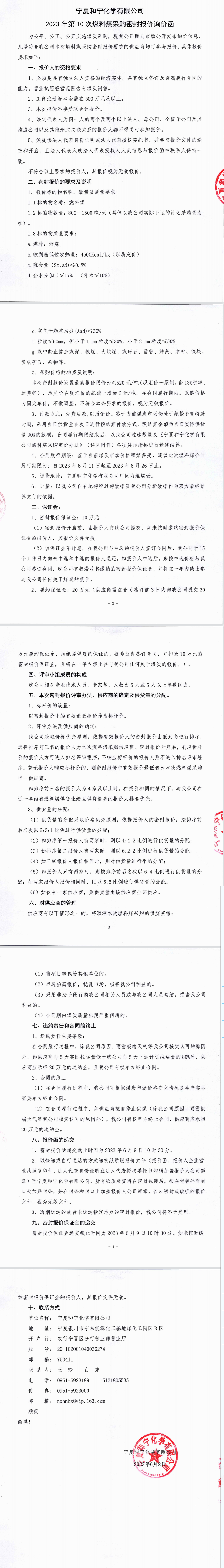 寧夏和寧化學(xué)有限公司2023年第10次燃料煤采購(gòu)密封報(bào)價(jià)詢價(jià)函