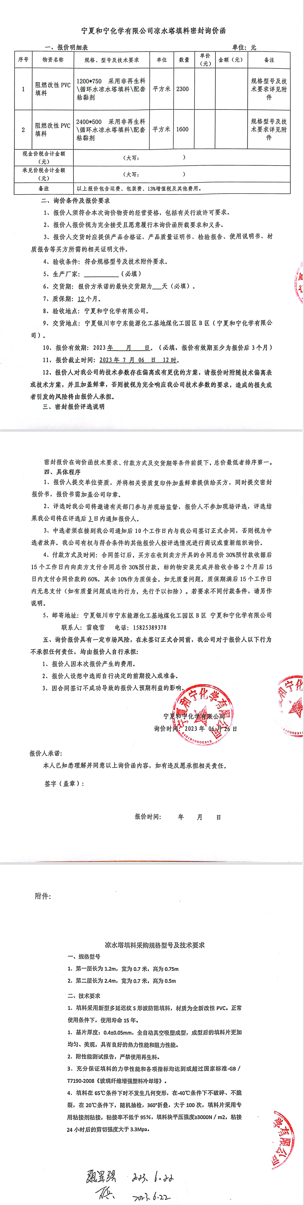 寧夏和寧化學(xué)有限公司涼水塔填料密封詢價函