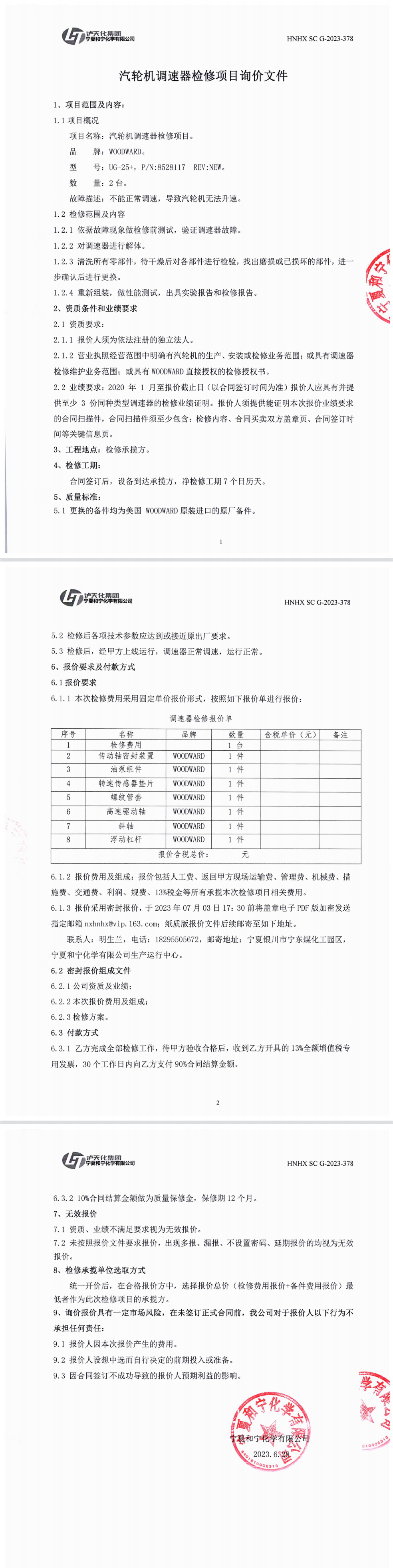 汽輪機(jī)調(diào)速器檢修項(xiàng)目詢價(jià)文件