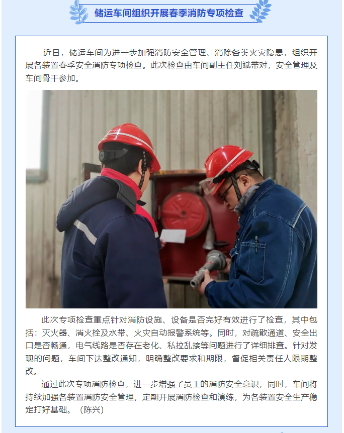 儲(chǔ)運(yùn)車間組織開展春季消防專項(xiàng)檢查