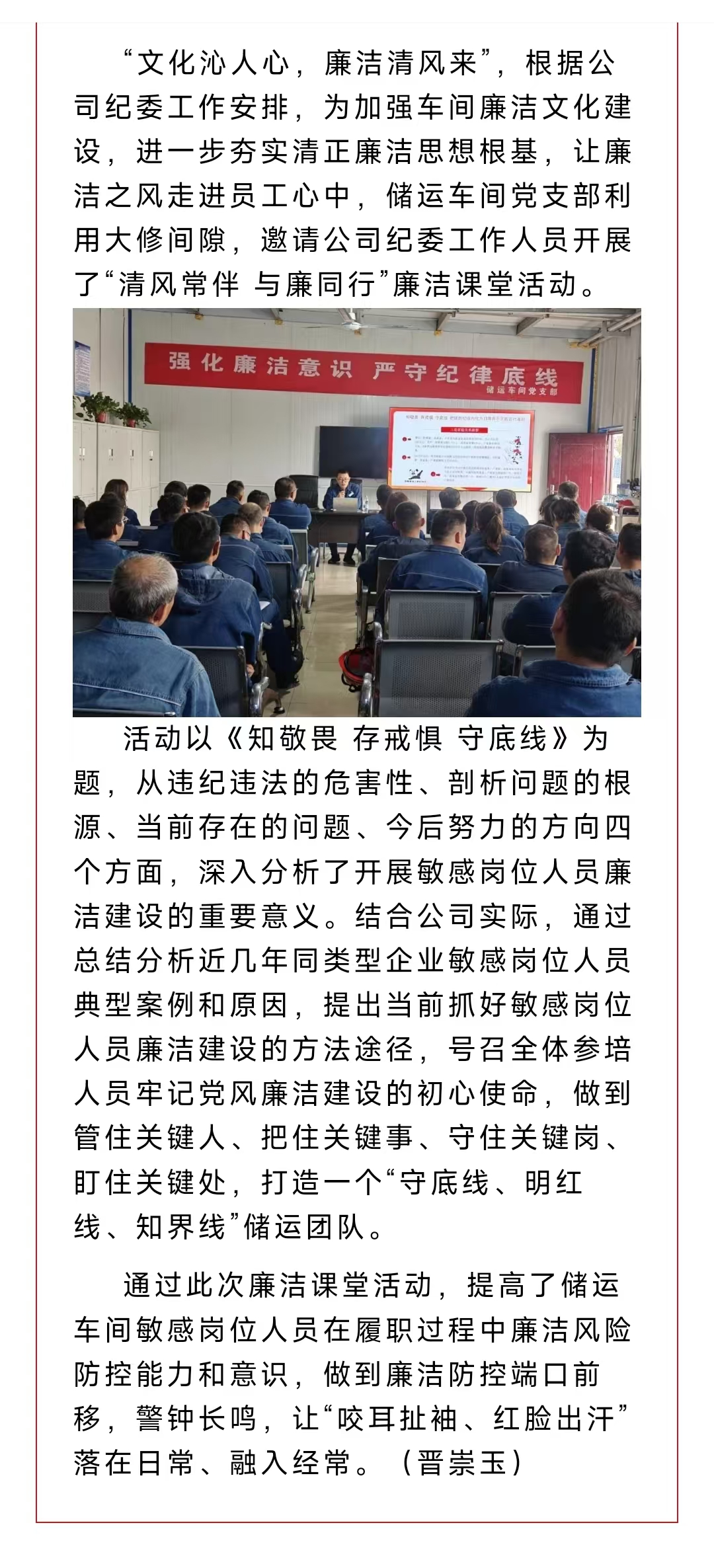 儲(chǔ)運(yùn)車間黨支部開展“清風(fēng)常伴 與廉同行”廉潔課堂活動(dòng)