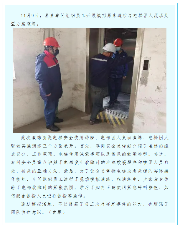 尿素車間開展電梯困人現(xiàn)場處置方案演練
